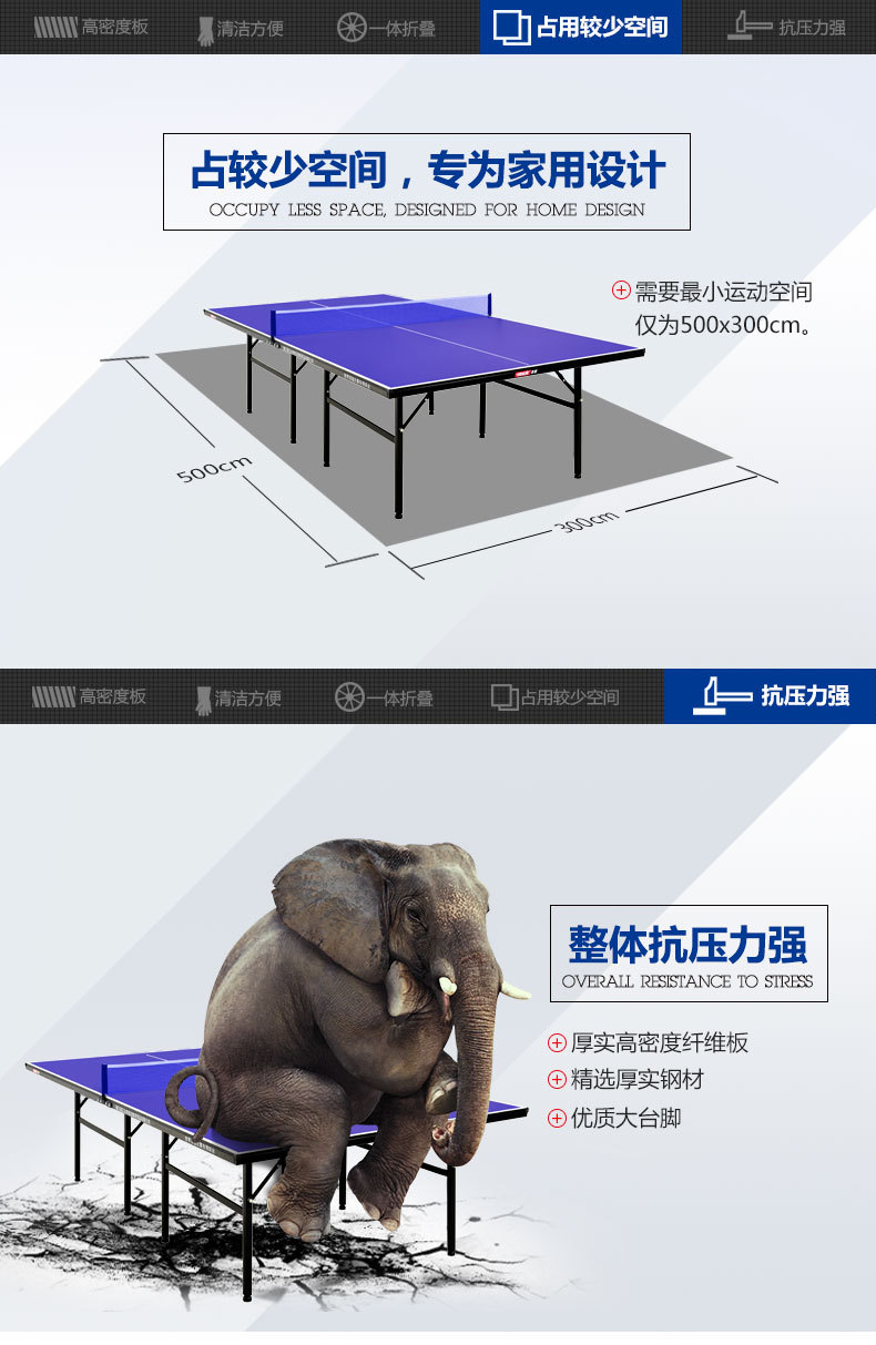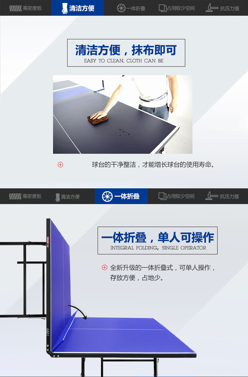 台面间联结,整体折叠,操作方便(打开包装立起就可以使用),通过CTTAA(中国乒乓球协会)认证。是一款高性价比的家用及训练型乒乓球台